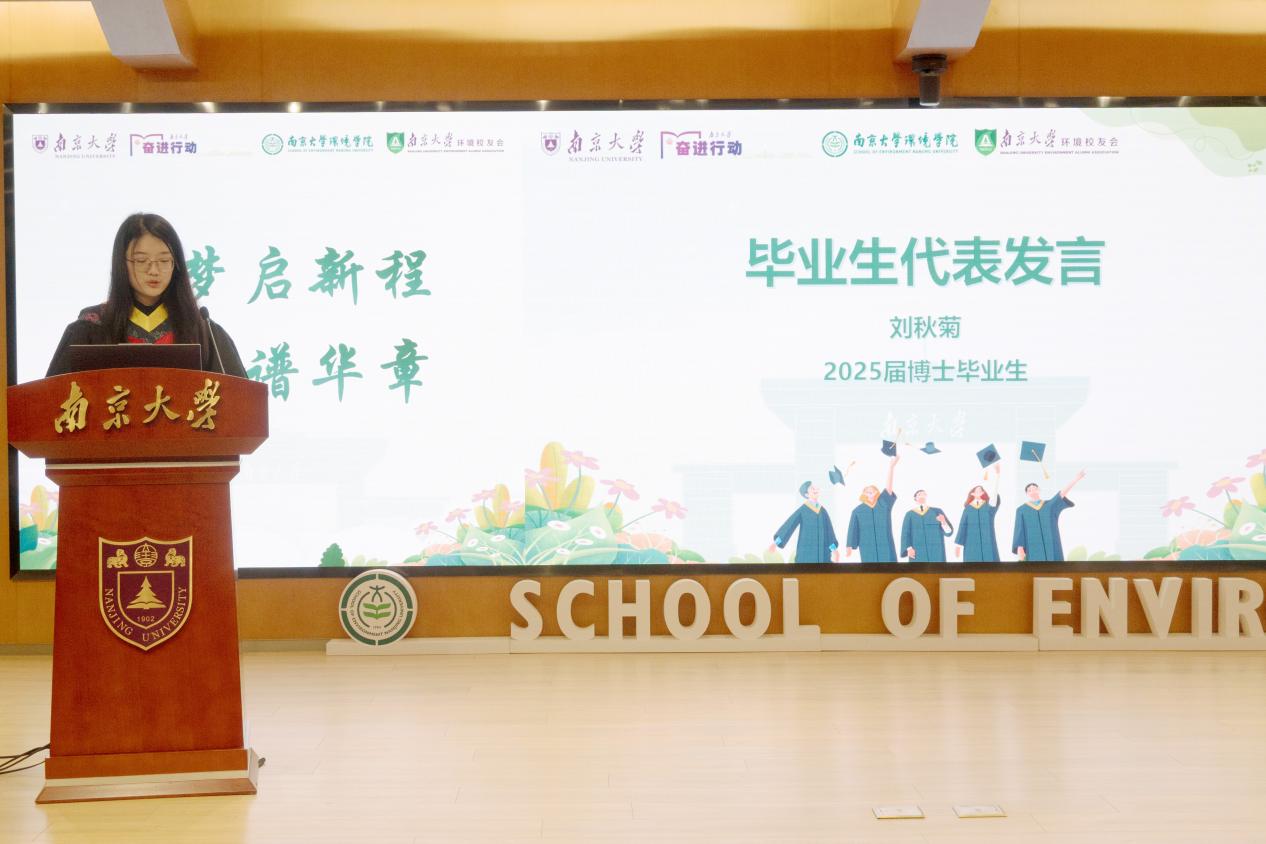 2025届博士毕业生刘秋菊作为毕业生代表发言。她表示在读期间受益于学院宝贵资源和平台,钻研专业知识,锻炼科研能力,不断拓宽视野,为生态文明建设贡献力量。未来也将继续努力,厚植家国情怀、涵养进取品格,以奋斗姿态激扬青春,在全面推进美丽中国建设中挺膺担当。